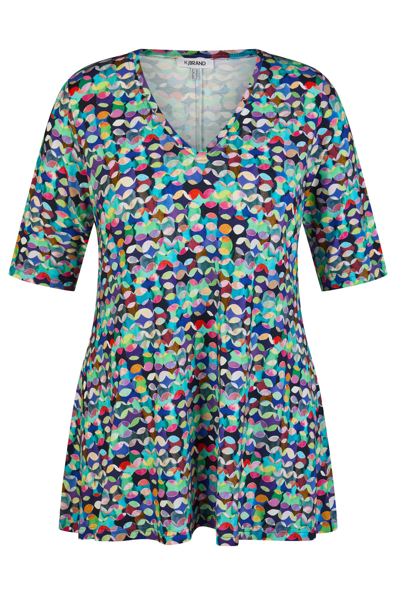 KjBrand printshirt, A-lijn model met V-hals. Dit licht uitlopende basic T-shirt van KjBRAND is een klassieke garderobe-essential voor elke gelegenheid. De viscose stretchstof heeft een subtiele glans en valt prachtig. De trendy jungleprint is een echte blikvanger.