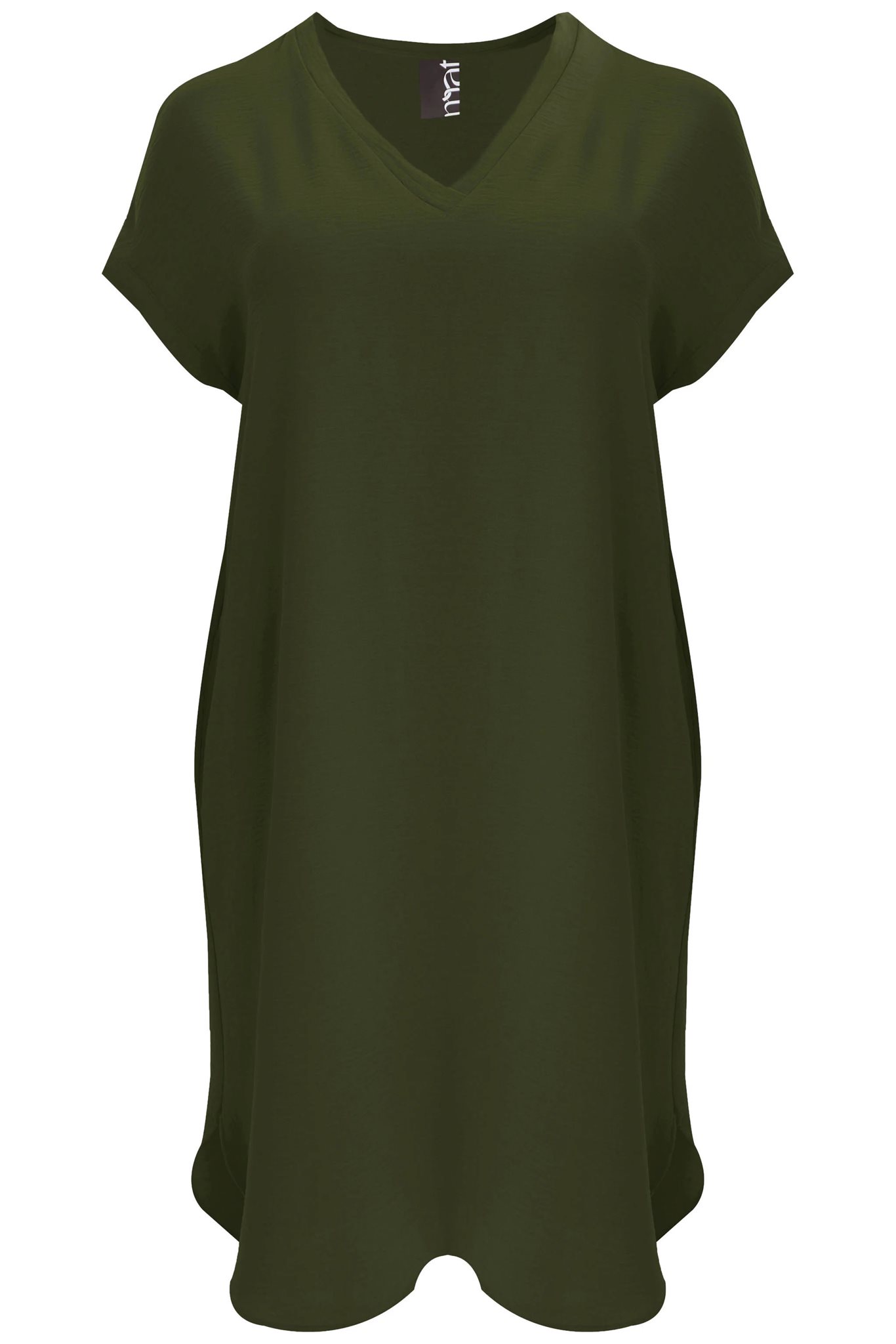 Deze olijfgroene damesjurk van het merk MAT heeft een wijd uitlopend silhouet en is afgewerkt met een diepe V-hals. De stof is effen groen en de jurk is voorzien van korte kapmouwtjes. Dit A-lijn model, voelt licht en comfortabel aan, ideaal voor een casual look.