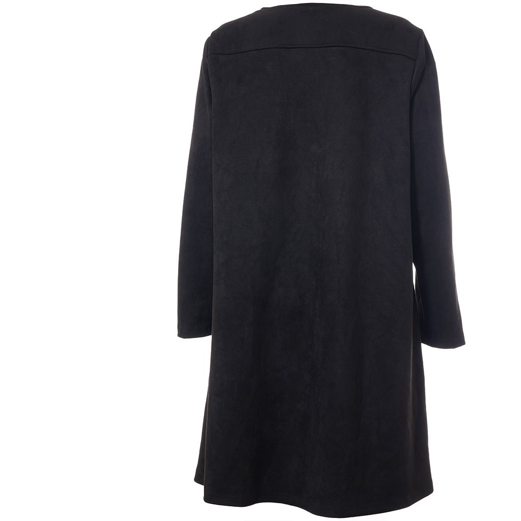 Zacht en eenvoudig effen vest in imitatie suède. De stijl heeft een ronde hals, lange mouwen en zakken aan de voorkant. Iets A-vormige pasvorm. De kwaliteit is zacht en rekbaar, een mix van polyester en elastaan.