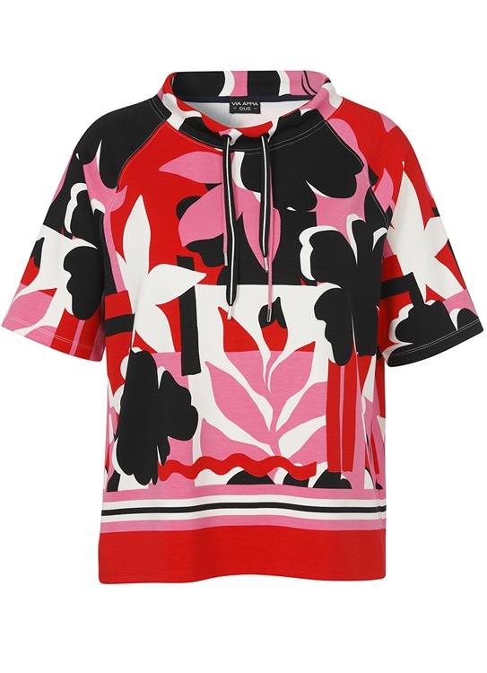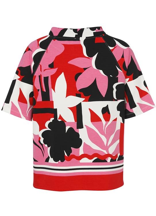De blouse heeft een ronde halslijn en kortere mouwen.