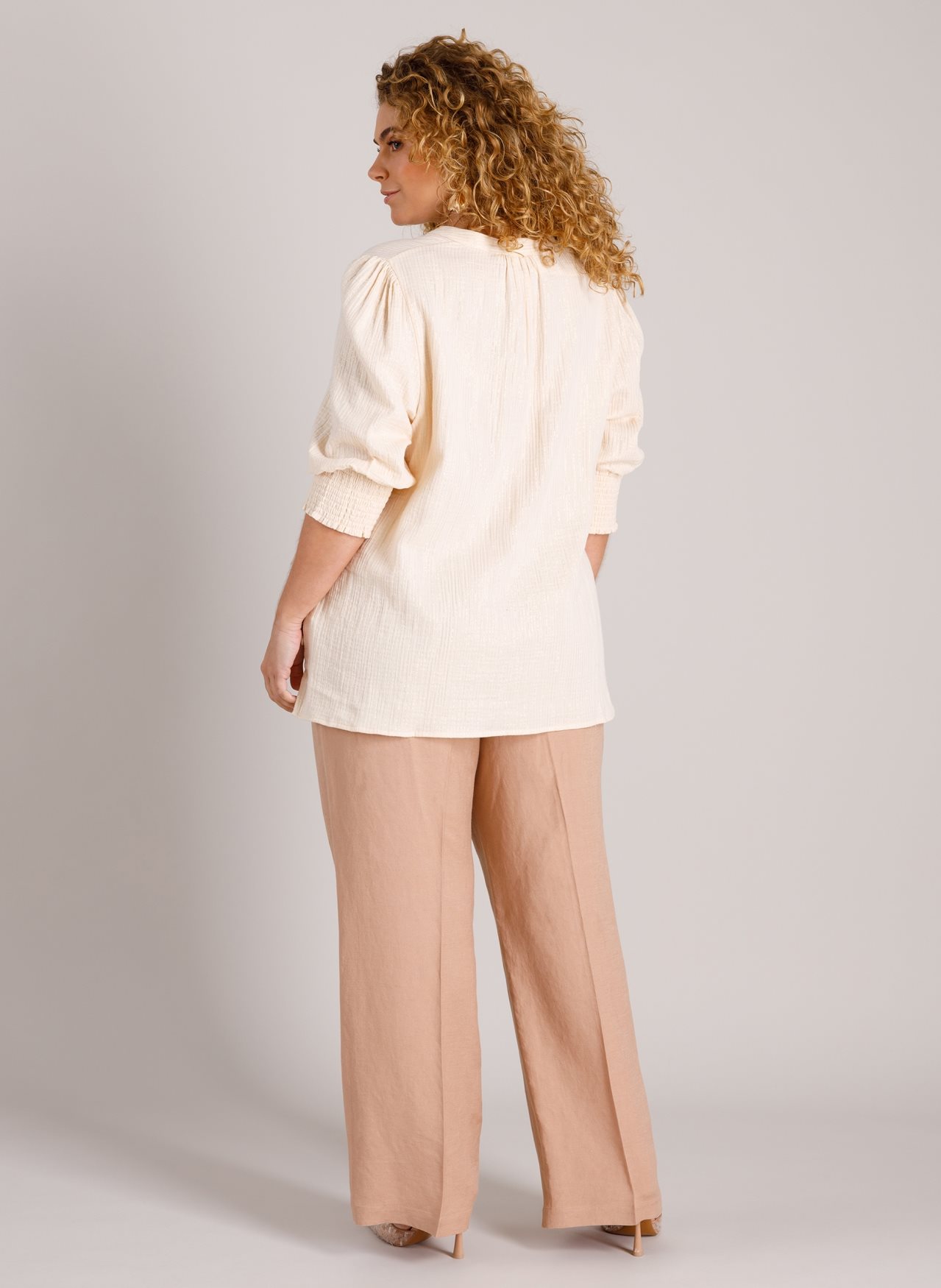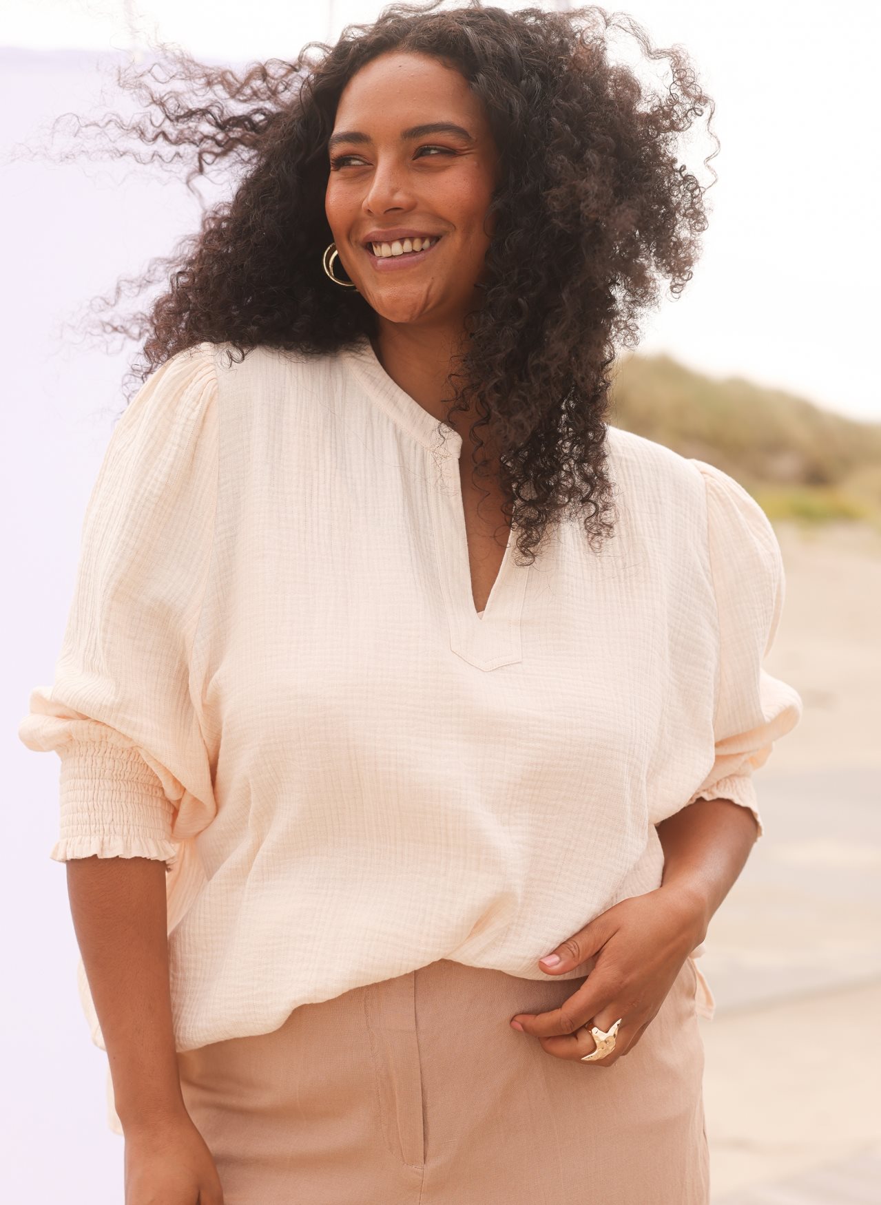 Deze katoenblouse van Yest Curve voelt licht en comfortabel aan, ideaal voor warme dagen. De gesmockte manchetten creëren een elegant pofeffect, terwijl de split halslijn zorgt voor een ontspannen uitstraling. Het geweven katoen heeft een subtiele structuur, waardoor de Luna eenvoudig te combineren is met zomerse basics.