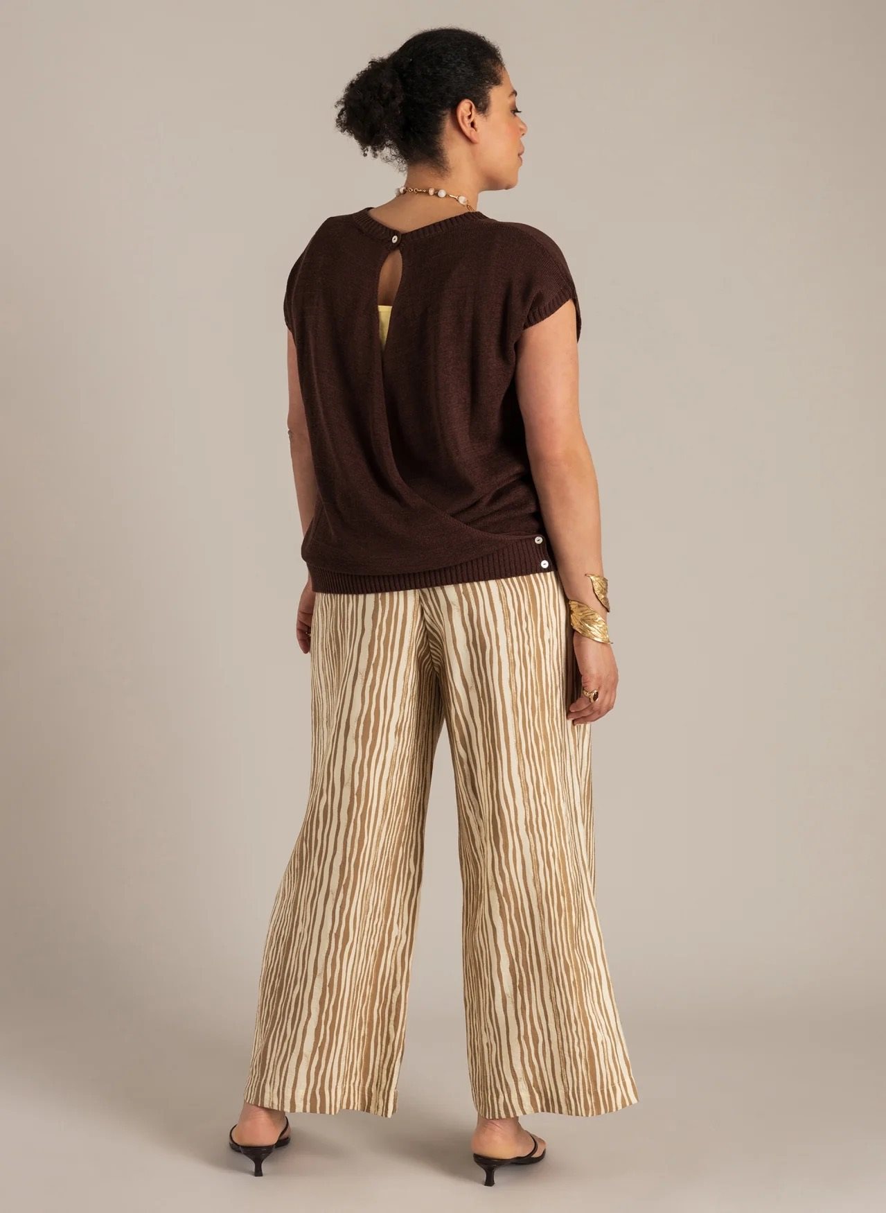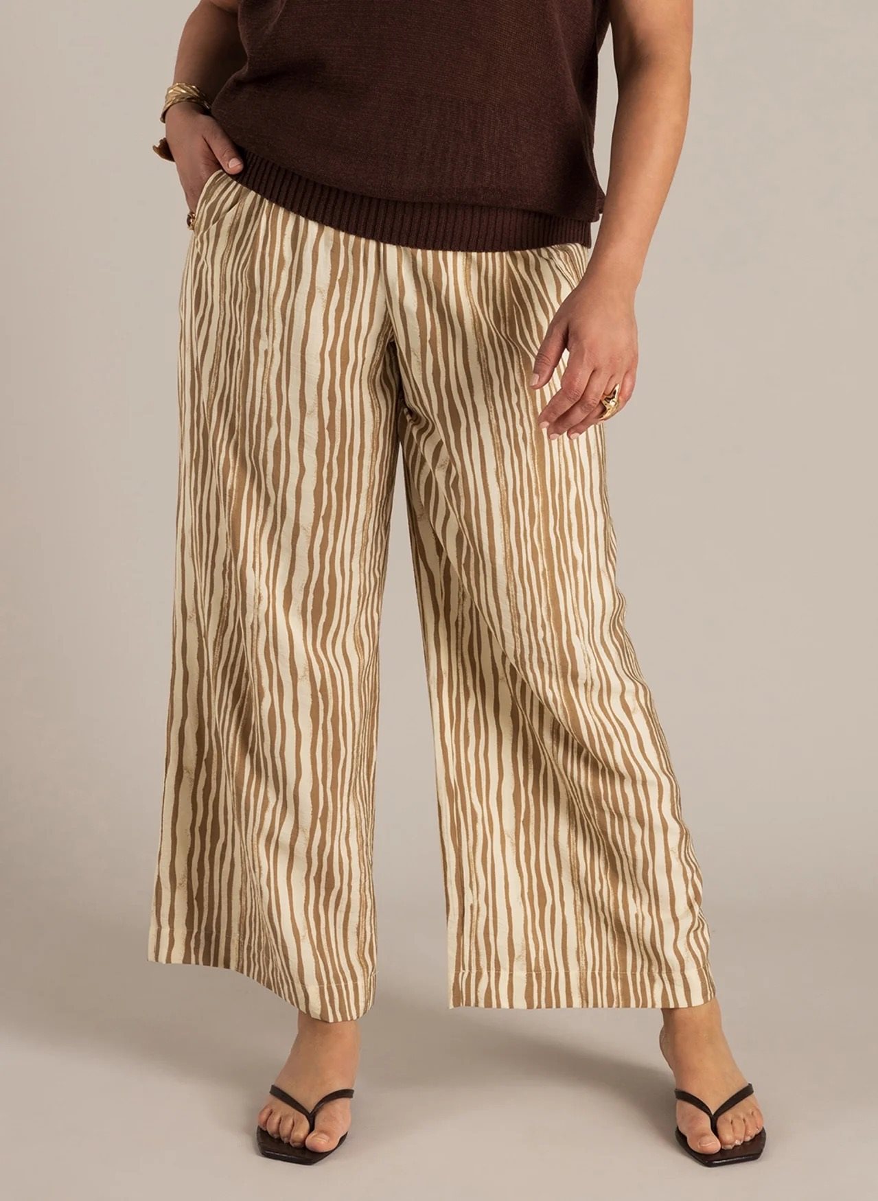 Deze gestreepte pantalon van Yest Curve heeft een verticaal patroon in taupe en lichte tinten. De broek is voorzien van wijde pijpen en een elastische tailleband voor een aansluitende pasvorm. Je vindt aan de voorzijde twee steekzakken die in het ontwerp zijn verwerkt.